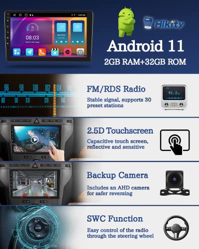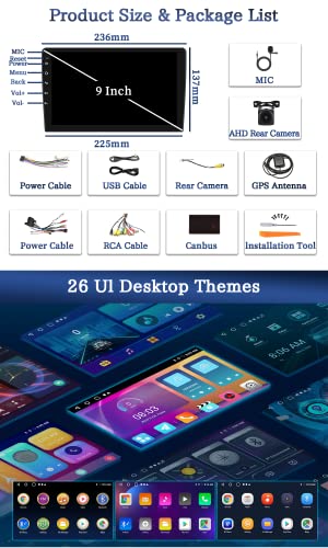 Autoradio Android 11: L'ultimo sistema operativo Android 11, quad-core, 2GB RAM+32GB ROM, funzionamento fluido e reattivo. Touch screen HD da 9". Supporta la funzione split screen, può visualizzare due pagine contemporaneamente. 26 diversi stili di temi, per regolare la schermata iniziale in qualsiasi momento