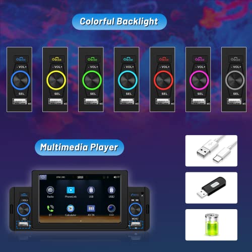 Autoradio 1 DIN con Schermo Touchscreen da 5": dimensioni standard 1DIN: 177 (L) x 50 (H) x 58 (W) mm. Schermo touchscreen HD da 5", reattivo. autoradio a singolo din con 2 porte USB, una per la ricarica del telefono e una per la lettura dei dati. Il sistema multimediale di bordo supporta 7 impostazioni di illuminazione dei tasti a colori