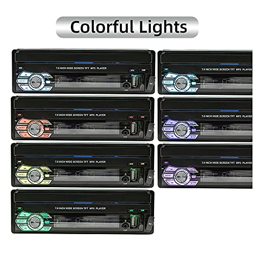 Autoradio 1 Din con Schermo: Motorizzato schermo 7", touchscreen LCD capacitivo ad alta definizione 1024*600p, con interfaccia dinamica del menu. Retroilluminazione dei tasti a sette colori regolabile. Dimensione dell'installazione stereo auto: 7.4 (L) * 5.4 (W) * 2.3 (H) pollici, universale per le automobili di 1 din, può misura la maggior parte del veicolo.