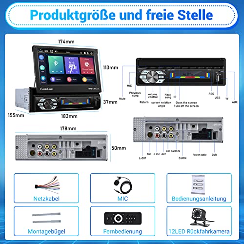 Hikity Carplay Autoradio 1 Din con Schermo a Scomparsa Estensibile Automatico da 7 Pollici Auto Radio con Bluetooth Vivavoce Android Auto Collegamento Specchio USB FM AUX Telecamera per La Retromarcia