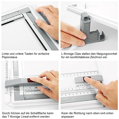 Quadrato a T e triangolo: il righello quadrato a T scorre su e giù su una guida in plastica, mantiene un bel angolo di 90° e può essere bloccato su entrambi i lati della tavola. Il triangolo con fissaggio ad angolo scorre in una scanalatura sul quadrato a T, per un facile spostamento avanti e indietro.