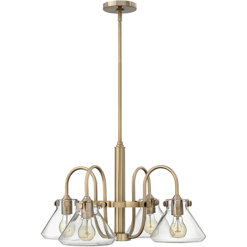 Collezione Congress MIX DI STORIA E MODA Lampadario in vetro trasparente a 4 luci - Caramello Spazzolato. Congress è un design tradizionale che combina elementi storici e alla moda. Questi eleganti paralumi retrò in vetro trasparente sono disponibili in due forme diverse e sono il perfetto tocco vintage per qualsiasi arredamento. Per un effetto ottimale, si consiglia di utilizzare lampade a filamento LED.