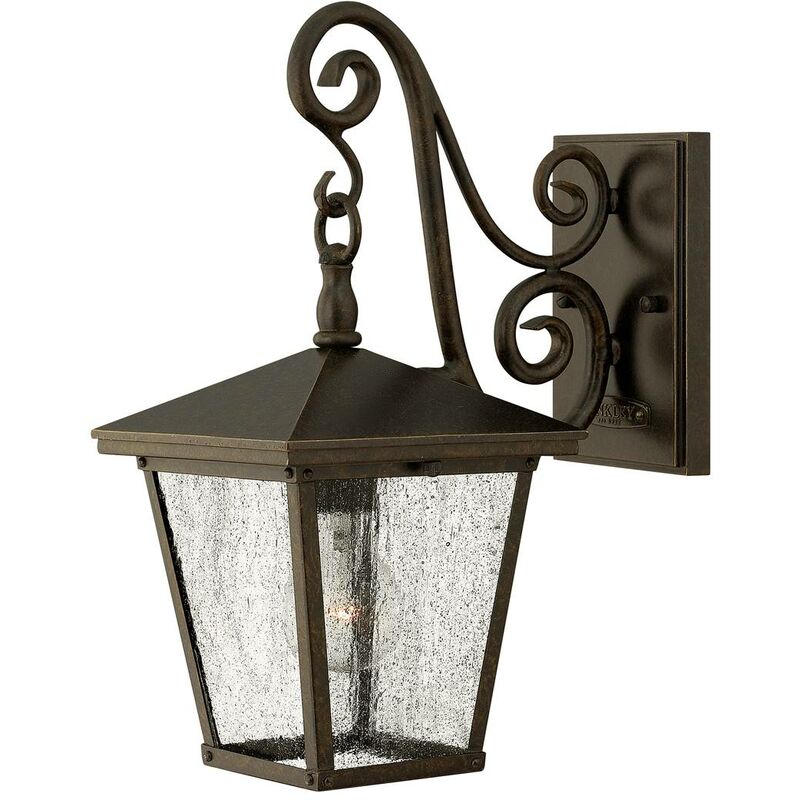 Lampada a muro Trellis 1xe27 H: 38.7 L: 28.6 B: 17.8 IP44 Dimensioni in mm: Altezza: 387, larghezza: 178, profondità: 286, Peso in kg: 2430 mezzo luminato incluso: no Tipo di lampada/versione: e27 Prestazioni massime in Watt: 100 Dimmbar: No Classe di protezione: ip44 materiale per la casa: acciaio morbido, set vetro Colore: Regency Bronze