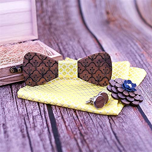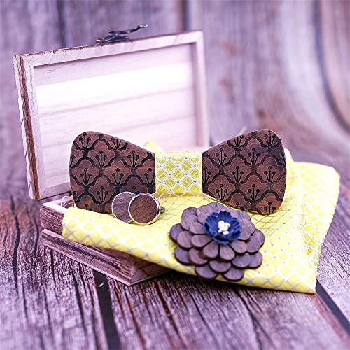 Hinleise Spilla quadrata con papillon in legno, da uomo, motivo intagliato a fiori, con scatola per abiti, camicia, smoking, accessori regalo