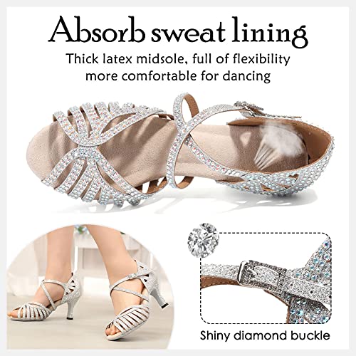 HIPPOSEUS Scarpe da Ballo Latino Americano Donna con Strass Argento Salsa Bachata Tango Professionale Scarpe da Ballo Tacco 7.5cm,Modello L380,34 EU