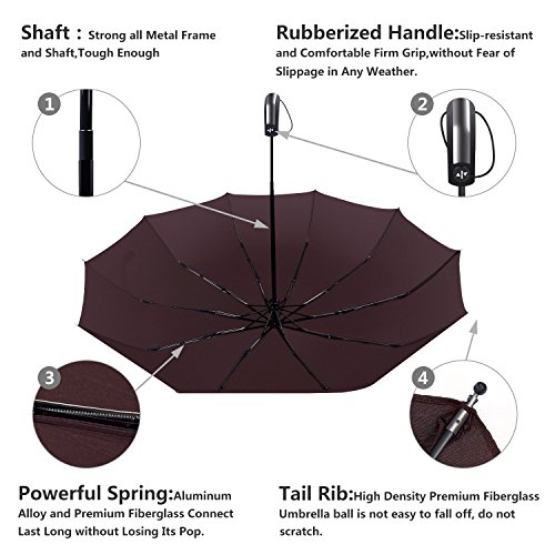 WINDPROOF DESIGN - 10 reinforced fiberglass ribs with strong all metal frame and shaft,our windproof umbrellas are tough enough to endure 60 MPH wind gusts.Every detail of our umbrellas are designed with the user in mind from the perfect rubberized ergonomic handle with finger-notches provides a better grip feeling and reduces wrist fatigue.