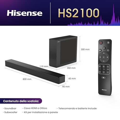 Hisense HS2100 Soundbar 2.1, 240W, Subwoofer Sottile Esterno wireless, Supporta Dolby Digital e DTS Virtual:X, Bluetooth, HDMI, USB, Ingresso Audio Ottico