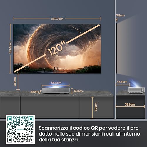 Hisense Laser TV 120" 4K 2023 120L5HA, Schermo anti-riflesso ALR, 2700 lumen, 4K, HDR10, Smart TV VIDAA 6.0, Dolby Vision e Atmos, Apple Airplay 2 & Home Kit, Alexa, tivùsat 4K, Installazione Gratuita