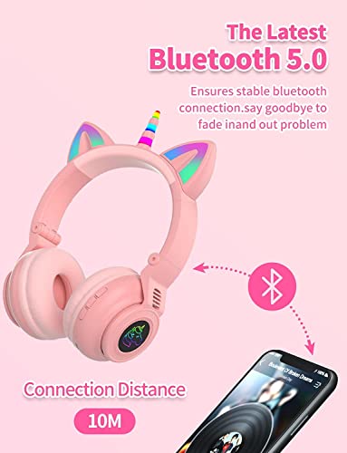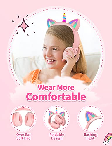 Hisonic Cuffie Bluetooth per bambini, con unicorno, con luci colorate, microfono e slot per schede SD per bambini dai 3 anni in su. (rosa)