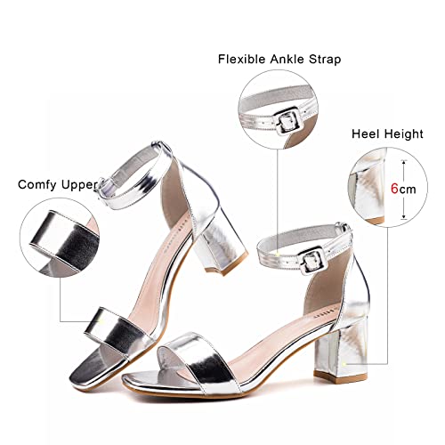 Hitmars Sandali Donna Eleganti Estive Sandali Tacco Comodi Cerimonia Largo Heeled Sandals Sandalo Punta Aperta Moda Cinturino Alla Caviglia Argento EU 37