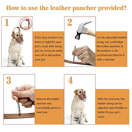 Regolabile e durevole: il delicato cinturino in pelle è regolabile e facile da indossare, non si crepa o si rompe facilmente. I fori sulla cinghia aiutano a regolare la tensione della museruola, impedendo che la museruola cada. Viene fornito anche un perforatore in pelle per fare più fori nel cinturino