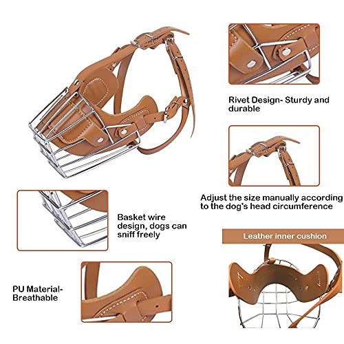 Museruola in metallo in pelle a copertura ampia: rispetto alla museruola in pelle o nylon, questa museruola in metallo per masticare ha una migliore ventilazione. La sua forma mantiene anche questa museruola anti corteccia dalla deformazione. La pelle sotto il filo è spessa e ha una copertura in pelle resistente e durevole, senza preoccuparsi che il cane venga graffiato dalla rete metallica
