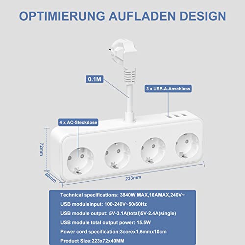 HITRENDS Ciabatta elettrica con USB, multipresa 4 prese e 3 USB (cavo 0,1 m), presa multipla 7 in 1 con interruttore, presa USB con interruttore e prolunga da 0,1 m per smartphone, ufficio,