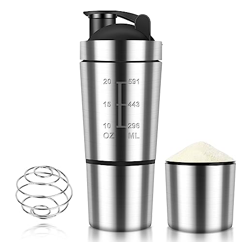 HIULLEN Shaker Bottle, 600+200ML Shaker proteico in acciaio inox, Shaker per Proteine con Sfera In Acciaio Inossidabile per Sport, Fitness E Regali (d'argento)