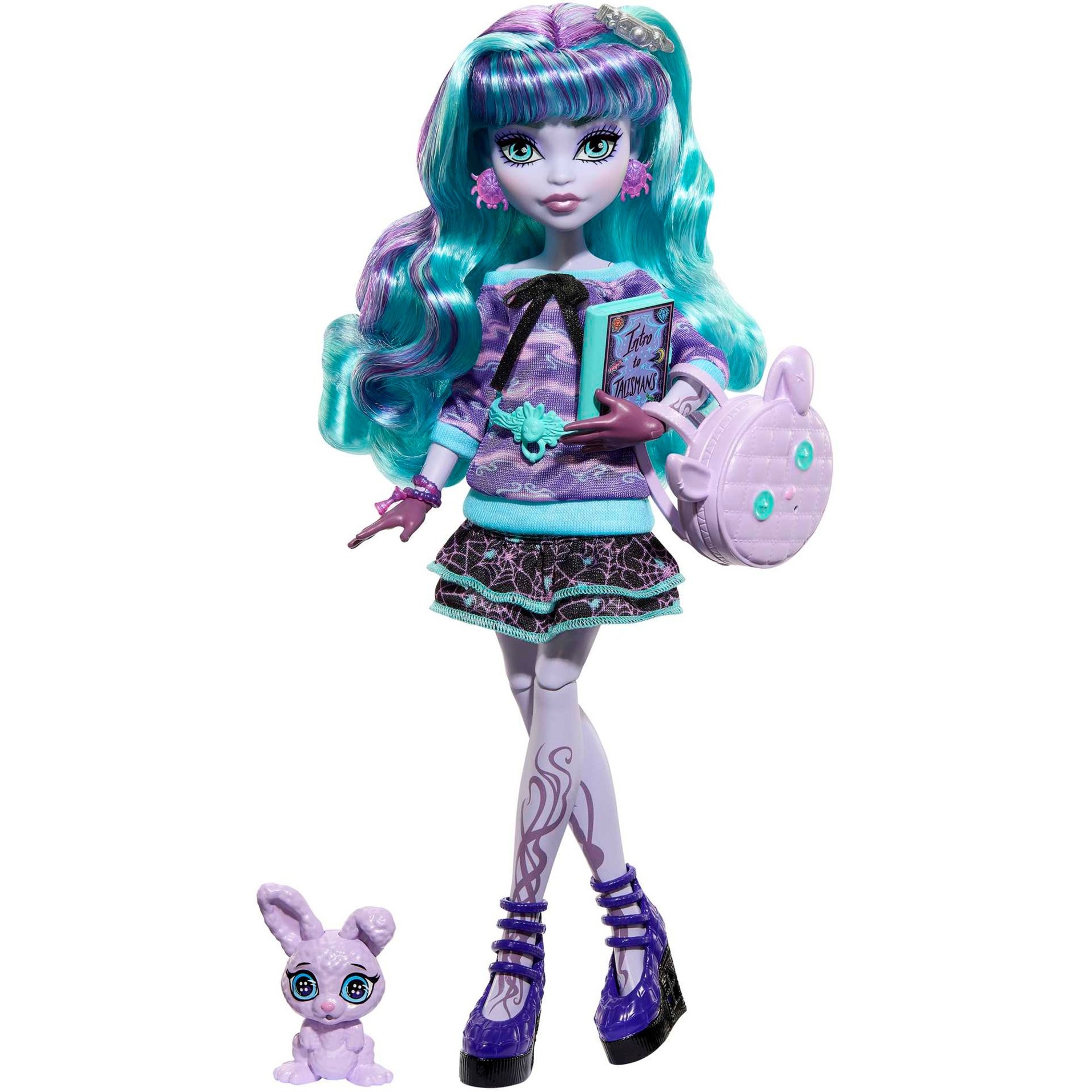 Anche le feste Pyama sono molto popolari a Monster High e le bambole della serie Creepover di Mattel sono ben attrezzate per questo! Ogni bambola è dotata di un fantastico look spettrale, accessori per la festa e il suo animale domestico. Come mostro ombra, Twyla può manipolare le ombre e immergersi nei sogni: il suo vestito con un comodo maglione lavorato a maglia, una gonna a balze con dettagli a ragnatela, tacchi e un cappuccio di raso con orecchie da coniglio è davvero da incubo. Completano il suo outfit un fermaglio per capelli a forma di maniglia, orecchini a forma di scarabeo, un bracciale a clessidra e una cintura con battente. Dustin, il suo coniglietto di polvere, è sempre al suo fianco.