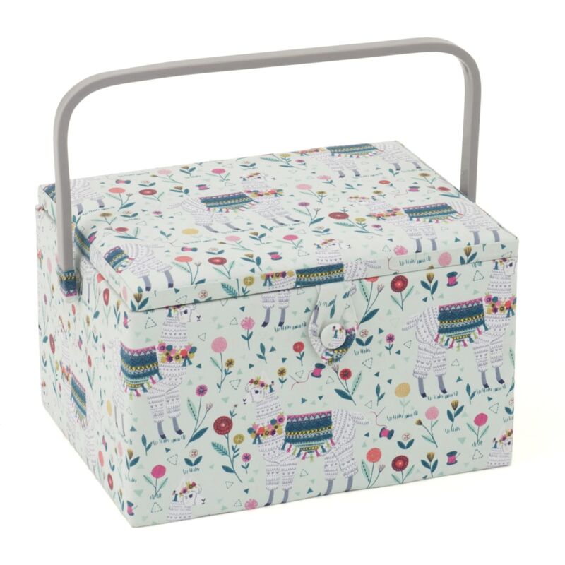 Grande scatola da cucito foderata con tessuto 100% cotone. Manico in plastica. Vassoio interno in plastica rigida con scomparti per accessori da cucito. Tasca interna e puntaspilli all'interno del coperchio. Pulisci solo le macchie. Dimensioni articolo: (profondità/larghezza/altezza) 23,5 x 31 x 20 cm.