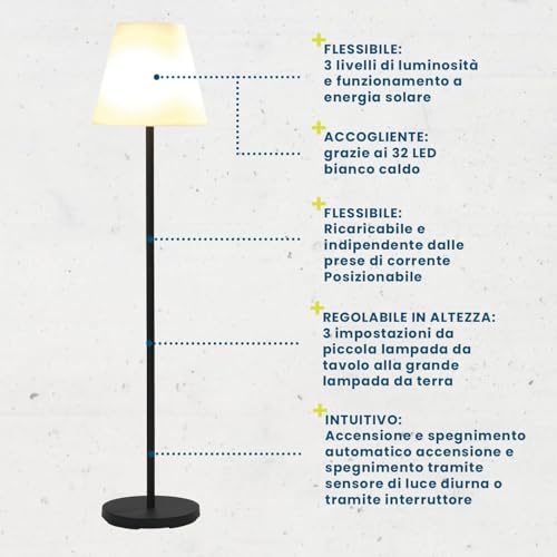Hoberg Lampada da terra solare | Senza fili e dimmerabile | LED bianchi caldi | Ricaricabile tramite cavo solare e USB | Con sensore di luce e interruttore | Adatta per interni ed esterni [IP44]