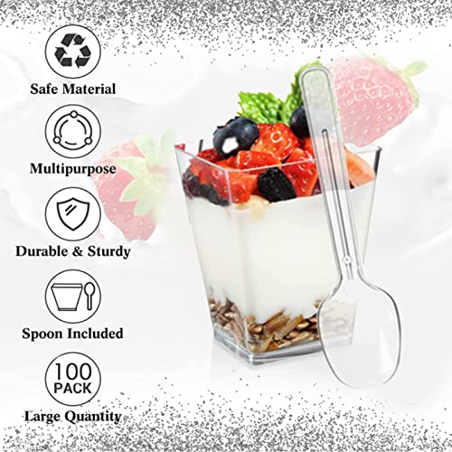 HOBIANO 50 PCS Bicchieri Da Dessert In Plastica, Mini Coppette Da Dessert 60ml Quadrate Coppa Parfait Trasparente Ciotola Con 50 Cucchiai Da Zuppa, Riutilizzabili Per Mousse, Budini, Gelati, Buffet