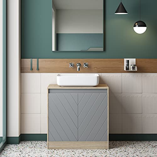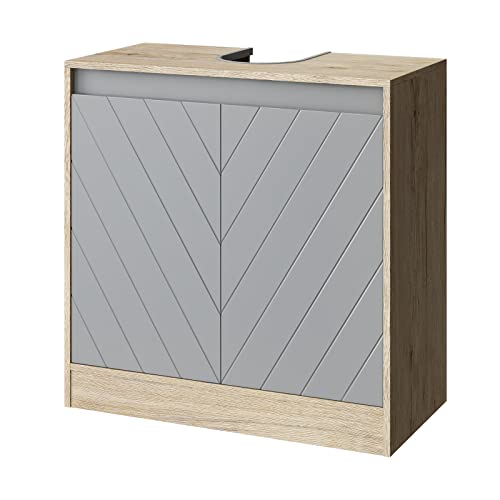 Classico e unico: il nostro armadietto per lavabo nella classica combinazione di colori rovere + grigio con linee geometriche intagliate sulle porte ha un look unico, che distingue facilmente il tuo bagno dagli altri