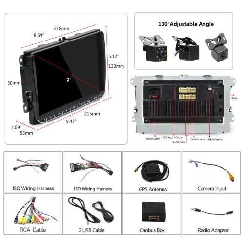 【Autoradio Android da 9 pollici】 L'autoradio capacitiva TFT touch screen 2 din è dotata di Quad Core 1 GB RAM e 16 GB ROM. Puoi goderti tutte le funzionalita del software Android e il tuo funzionamento piu veloce e intelligente. Questa autoradio supporta anche radio FM, doppie porte USB, controllo del volante, ecc. Nota: il pacchetto include una scatola canbus e un cavo ISO. La dimensione dell'installazione è 215 (L) * 130 (H) * 53 (L) mm.