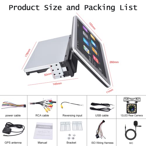 【Autoradio Android 1 Din Ruotabile 10 Pollici】Questa autoradio con touch screen in vetro temperato a specchio da 10 pollici ad alta definizione 2,5D può essere ruotata di 180° e può essere regolata manualmente su una visualizzazione orizzontale o verticale in qualsiasi momento. Offre l'esperienza visiva e tattile più confortevole possibile. Le dimensioni di installazione dell'autoradio universale a 1 din sono: 178 * 50 * 145 mm. Le dimensioni dello schermo sono 260*11*155 mm