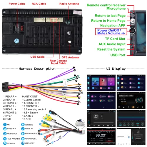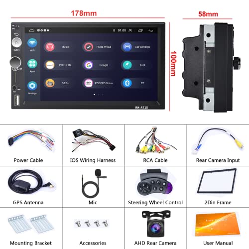 【Autoradio Android 11】Quad-core, 2 GB di RAM + 32 GB di memoria ROM rende l'unità principale più fluida. Si tratta di un'autoradio android universale a doppio din, la cui dimensione di installazione è di 178*100 mm, con un telaio a 2 din, adatto alla maggior parte delle console centrali per auto a 2 din di uso generale. Touch screen di alta qualità da 7 pollici a capacità TFT con alta risoluzione 1024*600. Con cavi di alimentazione generali e cavi di alimentazione ISO