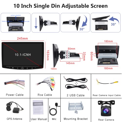 【Radio Touch Screen HD 10,1 Pollici】 L'autoradio 1 din è dotata di specchio in vetro temperato 2,5D con alta risoluzione 1024*600, lettore multimediale capacitivo touchscreen per auto, più sensibile e migliore esperienza visiva. Supporta lo schermo diviso, supporta la riproduzione video ultra chiara a 1080P, con doppio ingresso adattatore USB, microfono incorporato e microfono esterno. Dimensioni di installazione 180*50 mm