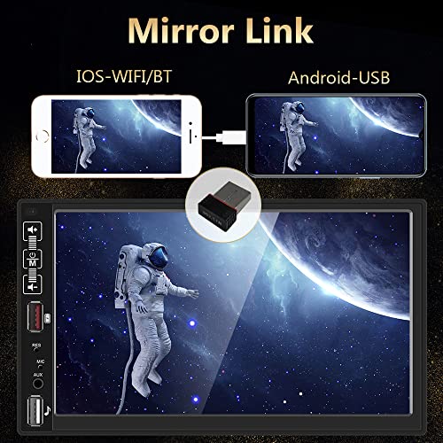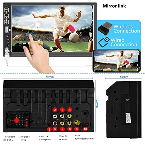 【Autoradio 2 Din con Schermo Touchscreen da 7 Pollici】:(1) Le dimensioni di questa autoradio universale a 2 DIN sono 178 (L) x 63 (W) x 102 (H) mm. Prima dell'acquisto, verificare che le dimensioni siano adatte alla console centrale della propria auto. (2) L'autoradio è dotata di uno schermo touch screen capacitivo da 7 pollici HD 1080P, che offre una migliore esperienza tattile e visiva (3).