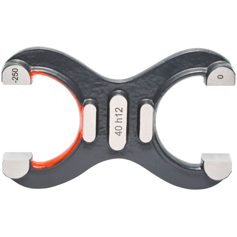 9 Dimensione nominale: 9 mm Calibro a forcella differenziale in acciaio per calibri di prima qualità temprato, sottoposto a distensione, rettificato e lappato. Lato passa con sovrametallo di usura a norma DIN 7163. Per campi di tolleranza ISO a − zc nei gradi di tolleranza base 6 − 13. Uso: Per controllare gli alberi negli accoppiamenti con gioco, intermedi o a interferenza. Norma: Toleranzen und Abmaße nach DIN EN ISO 1938-1 und DIN 7163. Nota: Definire la classe di tolleranza desiderata. Al momento dell'ordine indicare il campo di tolleranza (a − zc) e il grado di tolleranza base (6 − 13), ad es. n. art. 484222 Dim. 10f9. Calibri per grado di tolleranza base 5 e tolleranze più strette disponibili su richiesta. Dati tecnici Taratura L8 Attributo del nome del prodotto a − zc Tipo di prodotto Calibro a