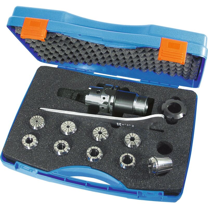 DescrizioneVantaggi:Maggiore durata grazie alla rotazione coassiale del sistema ≤ 10 µm.Sicurezza di lavorazione ottimale grazie alla forza di serraggio elevata. Migliore qualità della finitura superficiale (qualità tolleranze di produzione ridotte). Minori costi di produzione.Fornitura:Mandrino a pinza ER (con ghiera) n. art. 305390, inclusa valigetta in plastica.Chiave di serraggio ER n. art. 309680 Dim. 32, pinze di serraggio ER n. art. 308981ER 32 (470 E): D = 4, 6, 8, 10, 12, 14, 16, 18 e 20 mm.Dati tecnici per pinze di serraggio ER 32 Adattatore HSK-A 63 Tipo di prodotto Mandrini a pinza Codice articolo 305450 32 EAN / GTIN 4045197307934