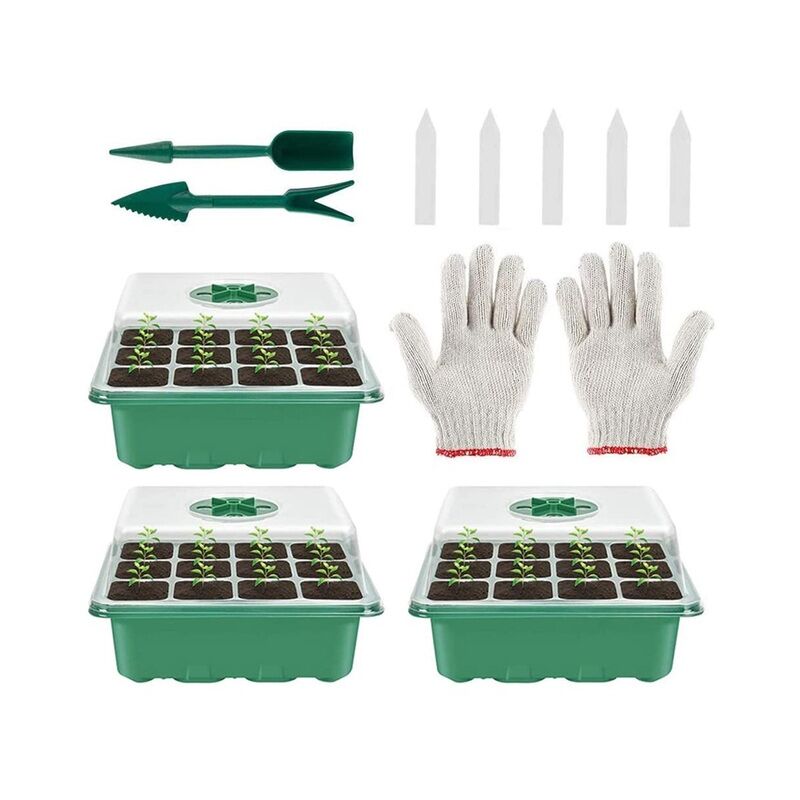 Description:Humidity Adjustable Plant Starter Kit with Dome and Base Greenhouse Grow Tray Mini Propagator for Seed Grow Starters (12 seedling ports per tray) Clear Seed Tray 1) This seed grow kit is manufactured with high-quality clear trays to easily observe your plants without interrupting the process.Features:1. The clear dome of the seed starter tray has 4 adjustable vents.2. These reinforced construction seed starting trays are sturdy and reusable.3. No damage to the plant's root system when transplanting.4. This set of 10 small, heavy-duty seed trays easily meets the needs and rhythms of different plant species.5. Each cell measures 1.5 inches square.5.A set of seedling pots (1 sump + middle transparent hole cavity pots + lid + ventilation valve as a set): weight 87gSize: 19*14*11cm 7.5*5.5*4.33inch3-piece set package size: 190 * 145 * 115mm weight 7.5 * 5.5 * 4.33inch: 315 grams5-piece set packing size: 200 * 145 * 115mm weight 7.87 * 5.5 * 4.33inch: 488 grams10-piece package