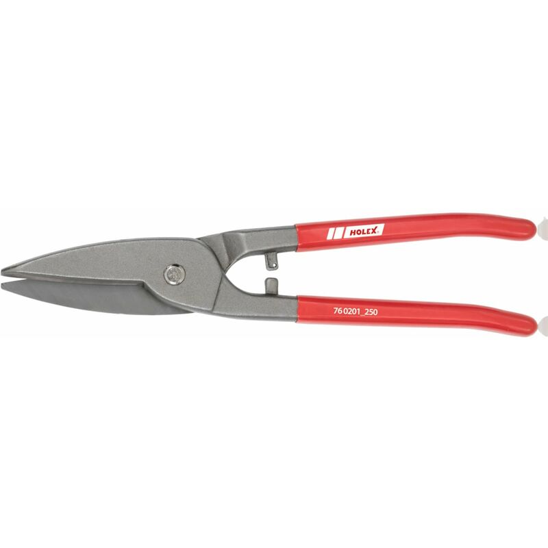 Forgiate. Testa della cesoia lucida, manici aperti verniciati normalmente o a immersione. In acciaio per utensili, taglienti temprati a induzione (HRC 58 − 60), anche per lamiere d'acciaio V2A fino a 1,0 mm. Uso: Per tagli diritti. Norma: Ähnlich DIN 6438 Dati tecnici Tipo di prodotto Cesoia Tipo di impiego destro Lunghezza complessiva, mm 250 Lunghezza taglienti, mm 60