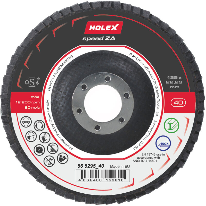 Corindone in zirconio (ZA) di alta qualità per garantire un'elevata potenza abrasiva. * Platorello in fibra di vetro per una pressione di contatto ottimale. * Per l'impiego universale su acciaio e INOX. * Massimi risultati con smerigliatrici angolari di tutte le classi di potenza. speed - disposizione in piano delle lamelle per un alto volume di truciolatura per unità di tempo e una durata elevata. Uso: Smussatura precisa, lavorazione di bordi e lavorazione in piano. Dati tecnici Materiale abrasivo Zirconio (ZA) Attributo del nome del prodotto ⌀ 115 mm Velocità periferica massima m/s 80 Sigla materiale abrasivo ZA Percentuale di ferro, zolfo e cloro % < 0,1 Acciaio < 900 N/mm² m/s idonea Ti m/s limitatamente adatta Acciaio < 1400 N/mm² m/s idonea Uni m/s idonea Acciaio < 55 HRC m/s idonea Acciaio < 67 HRC m/s idonea a secco idonea GG(G) m/s limitatamente adatta Acciaio < 60 HRC m/s idonea INOX m/s idonea Tipo di prodotto Disco abrasivo lamellare ⌀ Foro, mm 22,23 della forma piatto