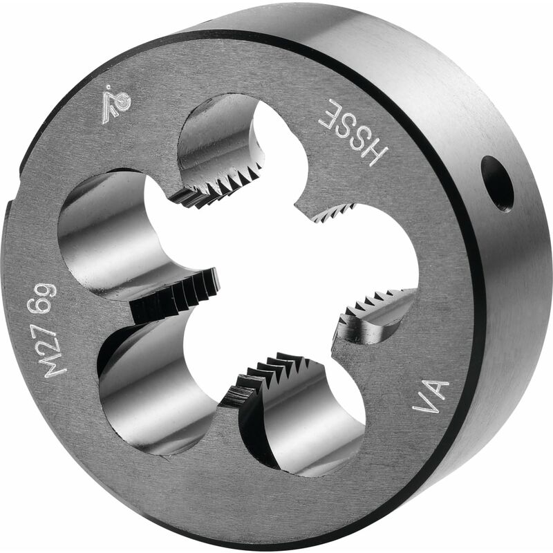 Forma chiusa preincisa. ≥ M3 con imbocco corretto su entrambi i lati per agevolare l'esecuzione del filetto ed evacuare correttamente i trucioli nella direzione di taglio. Imbocco a 2 spire. Lappate e nitrurate, angolo di spoglia superiore ca. 15°. Dati tecnici Acciaio < 750 N/mm² m/min idoneo Direzione di taglio destra INOX < 900 N/mm² m/min idoneo Materiale da taglio HSS E INOX > 900 N/mm² m/min limitatamente adatto Angolo di filetto Grad 60 Acciaio < 1100 N/mm² m/min idoneo Olio idoneo Tipo di prodotto Filiere Norma EN 22568 Acciaio < 500 N/mm² m/min idoneo Acciaio < 900 N/mm² m/min idoneo a secco limitatamente adatto Acciaio < 1400 N/mm² m/min limitatamente adatto Tipo di filettatura M Misura del filetto M27 Classe di tolleranza DIN 13 6g Passo, mm 3 Altezza, mm 25 ⌀ Esterno, mm 65