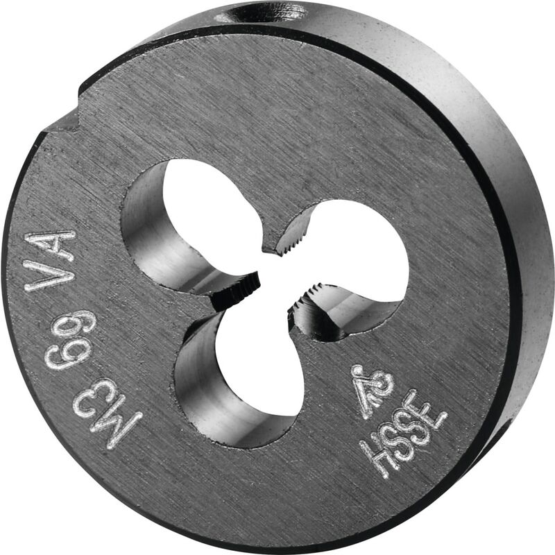Forma chiusa preincisa. ≥ M3 con imbocco corretto su entrambi i lati per agevolare l'esecuzione del filetto ed evacuare correttamente i trucioli nella direzione di taglio. Imbocco a 2 spire. Lappate e nitrurate, angolo di spoglia superiore ca. 15°. Dati tecnici Acciaio < 750 N/mm² m/min idoneo Direzione di taglio destra INOX < 900 N/mm² m/min idoneo Materiale da taglio HSS E INOX > 900 N/mm² m/min limitatamente adatto Angolo di filetto Grad 60 Acciaio < 1100 N/mm² m/min idoneo Olio idoneo Tipo di prodotto Filiere Norma EN 22568 Acciaio < 500 N/mm² m/min idoneo Acciaio < 900 N/mm² m/min idoneo a secco limitatamente adatto Acciaio < 1400 N/mm² m/min limitatamente adatto Tipo di filettatura M Misura del filetto M3 Classe di tolleranza DIN 13 6g Passo, mm 0,5 Altezza, mm 5 ⌀ Esterno, mm 20