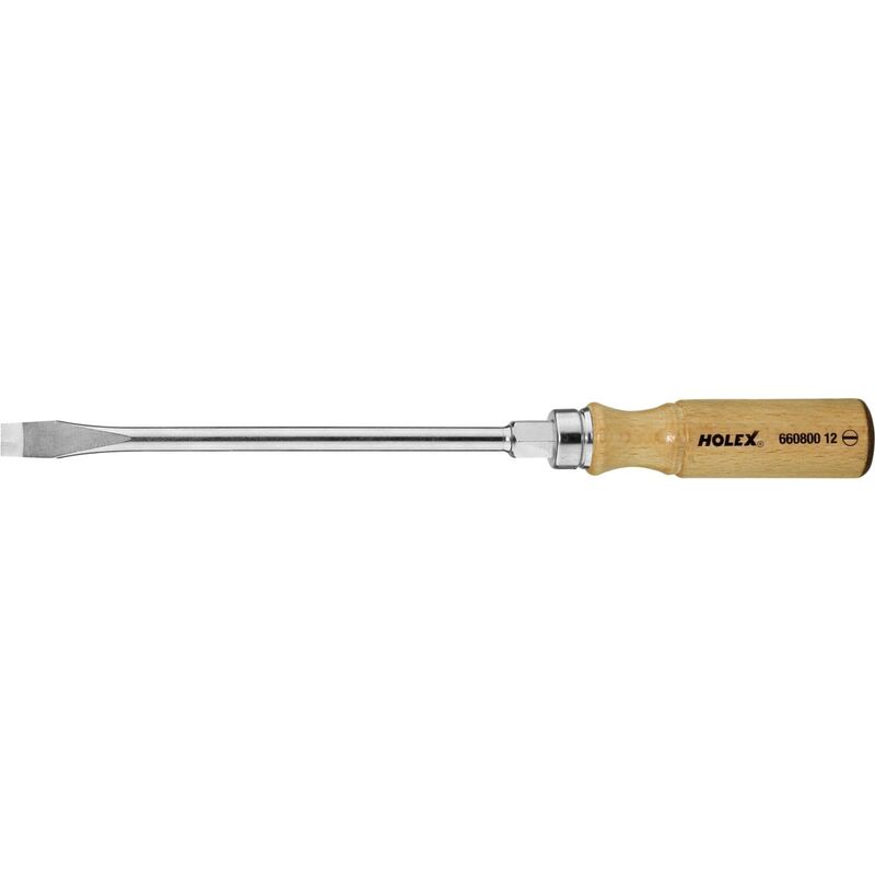Impugnatura in legno di faggio sigillato, con cappuccio di pelle. Lama in acciaio al cromo-vanadio, interamente temprata. A partire da Dimensione 5,5 lama passante con esagono di manovra. Superficie nichelata lucida. Dati tecnici Tipo di prodotto Giravite Lunghezza complessiva, mm 319 Lunghezza lama, mm 200 Larghezza delle punte b, mm 12 Spessore delle punte a, mm 2 Esagono di manovra, mm 13