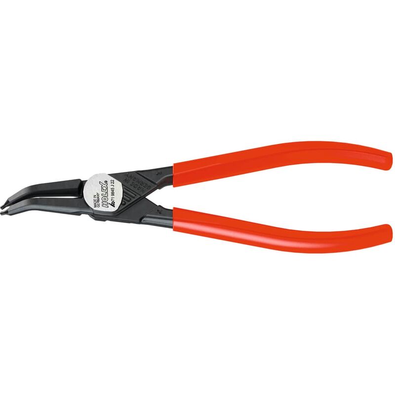 Forgiata in un unico pezzo. Pinza bonderizzata nera, manici rivestiti in plastica. Uso: Per il montaggio e lo smontaggio di anelli di sicurezza. Norma: Simile a norma DIN 5254. Materiale: Acciaio al cromo-vanadio, forgiato e temprato in bagno d'olio. Dati tecnici Superficie bonderizzata nera Materiale Acciaio al cromo-vanadio Impugnatura rivestiti in plastica Punte intercambiabili no Tipo di prodotto Pinza per anelli di sicurezza Lunghezza complessiva, mm 135 Norma simili a norma DIN 5254 ⌀ Punta, mm 0,9 Forma delle ganasce piegate a 45° Impiego pinze per anelli di sicurezza Anello esterno curvo Per anelli esterni di sicurezza di ⌀, mm 3 - 10