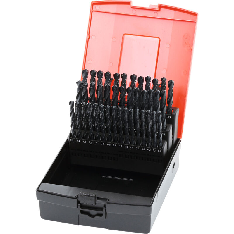 Composto da punte elicoidali a norma DIN 338. Esecuzione rullata, angolo dell'elica, spessore del nocciolo e conicità normali. Nessuna interruzione strutturale, quindi più elastiche e adatte a lavori di foratura robusta (per es. con trapani manuali). Esecuzione economica. Dati tecnici Olio idoneo Acciaio < 750 N/mm² m/min idoneo a secco limitatamente adatto Alluminio (a truciolo corto) m/min limitatamente adatto GG(G) m/min limitatamente adatto Acciaio < 500 N/mm² m/min idoneo a umido max. idoneo Acciaio < 900 N/mm² m/min idoneo Modello N Angolo di affilatura Grad 118 Tolleranza ⌀ nominale h8 Rivestimento non rivestito In cassetta sì Materiale da taglio HSS Colore collarino senza Passaggio interno per LR no Tipo di prodotto Punta elicoidale Codolo Codolo cilindrico Numero taglienti Z 2 Intervallo di diametri, mm 6 - 10 Numero di punte 41 Punte a misure crescenti di, mm 0,1