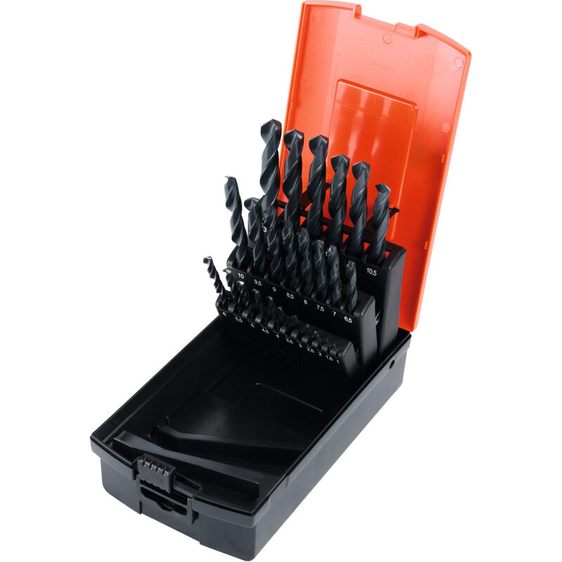 Composto da punte elicoidali a norma DIN 338. Esecuzione rullata, angolo dell'elica, spessore del nocciolo e conicità normali. Nessuna interruzione strutturale, quindi più elastiche e adatte a lavori di foratura robusta (per es. con trapani manuali). Esecuzione economica. Dati tecnici Olio idoneo Acciaio < 750 N/mm² m/min idoneo a secco limitatamente adatto Alluminio (a truciolo corto) m/min limitatamente adatto GG(G) m/min limitatamente adatto Acciaio < 500 N/mm² m/min idoneo a umido max. idoneo Acciaio < 900 N/mm² m/min idoneo Modello N Angolo di affilatura Grad 118 Tolleranza ⌀ nominale h8 Rivestimento non rivestito In cassetta sì Materiale da taglio HSS Colore collarino senza Passaggio interno per LR no Tipo di prodotto Punta elicoidale Codolo Codolo cilindrico Numero taglienti Z 2 Intervallo di diametri, mm 1 - 13 Numero di punte 25 Punte a misure crescenti di, mm 0,5
