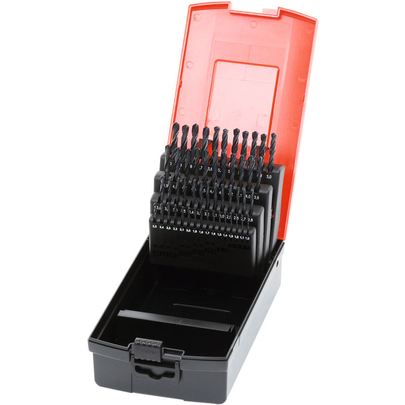 Composto da punte elicoidali a norma DIN 338. Esecuzione rullata, angolo dell'elica, spessore del nocciolo e conicità normali. Nessuna interruzione strutturale, quindi più elastiche e adatte a lavori di foratura robusta (per es. con trapani manuali). Esecuzione economica. Dati tecnici Olio idoneo Acciaio < 750 N/mm² m/min idoneo a secco limitatamente adatto Alluminio (a truciolo corto) m/min limitatamente adatto GG(G) m/min limitatamente adatto Acciaio < 500 N/mm² m/min idoneo a umido max. idoneo Acciaio < 900 N/mm² m/min idoneo Modello N Angolo di affilatura Grad 118 Tolleranza ⌀ nominale h8 Rivestimento non rivestito In cassetta sì Materiale da taglio HSS Colore collarino senza Passaggio interno per LR no Tipo di prodotto Punta elicoidale Codolo Codolo cilindrico Numero taglienti Z 2 Intervallo di diametri, mm 1 - 6 Numero di punte 51 Punte a misure crescenti di, mm 0,1