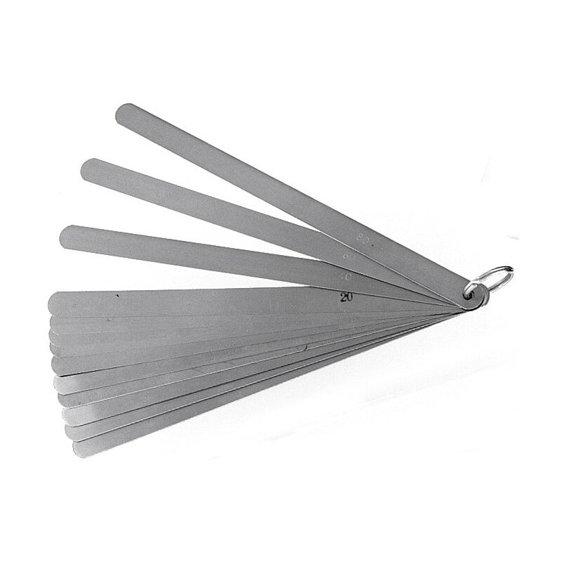 Lame rigide di acciaio con chiara marcatura. Lame in acciaio di eguale larghezza, chiusura a ventaglio mediante snodo rivettato. Lame in acciaio con terminale conico. Fodero nichelato, bloccabile. Spessimetro in acciaio, precisione T2. Dati tecnici Materiale Acciaio Accuratezza T2 Tipo di prodotto Spessimetro Tolleranza T3 Norma Norma interna Numero lame 13 Spessori lama, mm 0,05 − 0,25 (a increm. di 0,05) 0,3 − 1,0 (a increm. di 0,1)