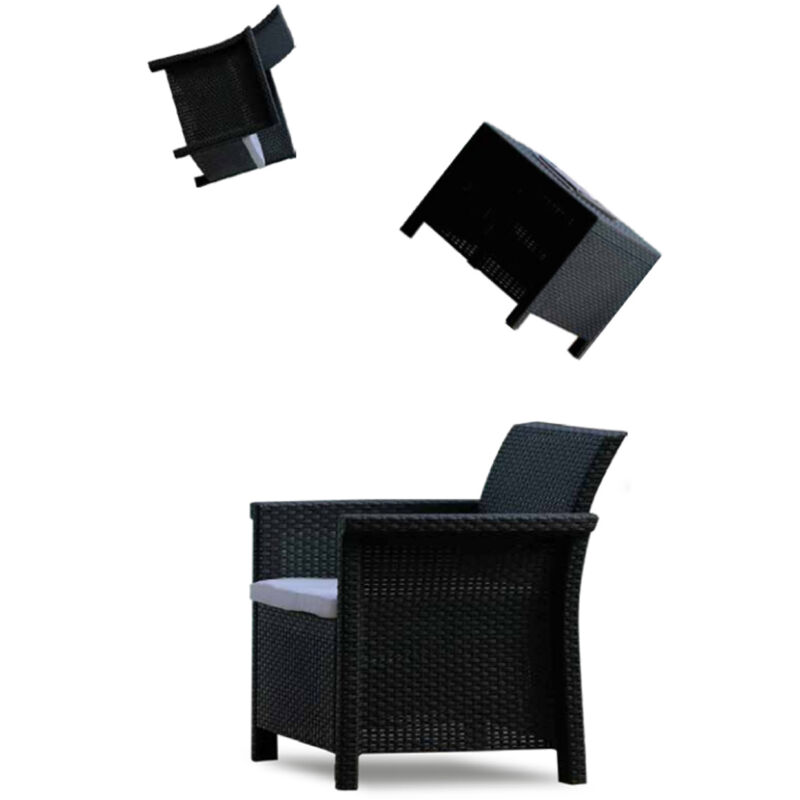 Set Holiday 2 Poltrone C/Tavolino Nero Salottino in polipropilene effetto rattan, resistente e duraturo, cuscini inclusi. Ideale sia per esterno che per interno. Composizione: 2 poltrone, 1 tavolino.