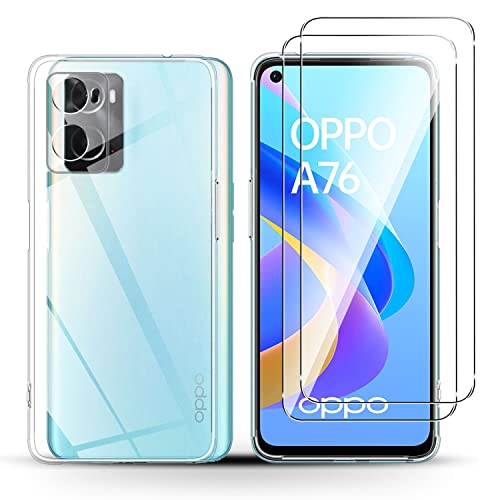Holilo Silicone Cover +2 Pezzi Vetro Temperato Pellicola per OPPO A76, Anti-graffio Antiurto Tocco Morbido Protezione Custodia Protettiva Case Durezza 9H Pellicola Protettiva - Trasparente
