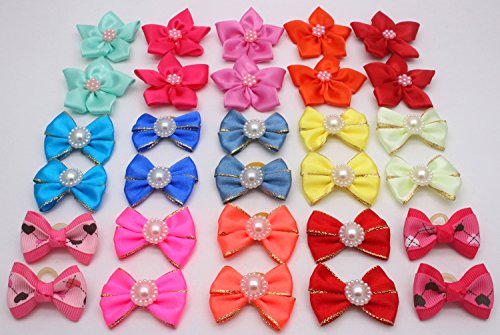 HOLLIHI 30Pcs/15 paia adorabile nastro grosgrain fiocchi per capelli con elastici - Cane cucciolo Topknot Cat Kitty Doggy Grooming Hair Accessories Bow nodi fiori copricapo set per Groomer