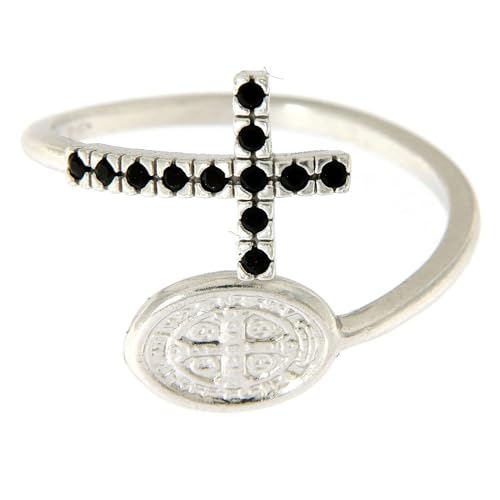Holyart Anello argento 925 medaglia San Benedetto e croce con zirconi neri