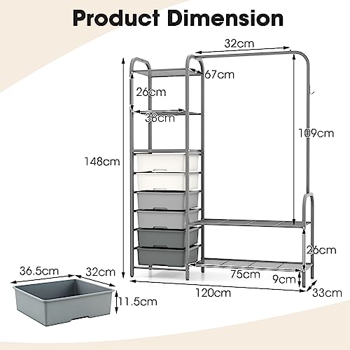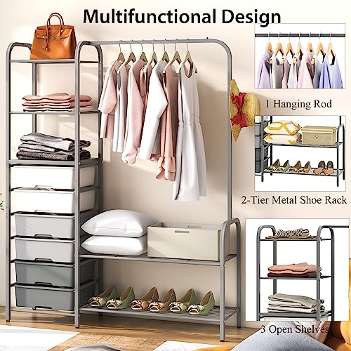 ~Ampio spazio di archiviazione~ Questo appendiabiti multifunzionale è progettato con 1 asta appendiabiti, 2 scarpiere, 3 ripiani aperti e 6 cassetti, che possono essere utilizzati per riporre diversi oggetti come vestiti, sciarpe, scarpe, ecc. In modo organizzato.