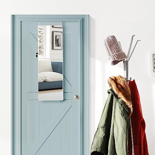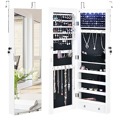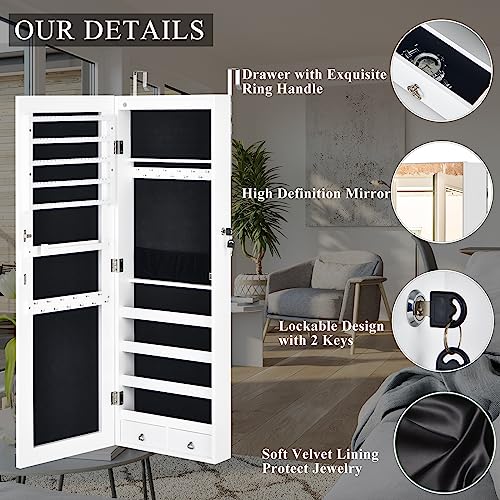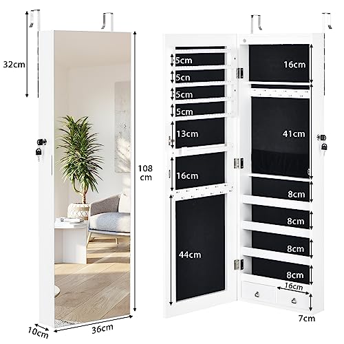 HOMASIS Specchio Portagioie da Parete con LED, Armadio Gioielli con Specchio Appendibile Porta e Muro, Specchiera Portagioielli con Chiavi, Armadietto Porta Gioielli per Collane, Orecchini, Bianco