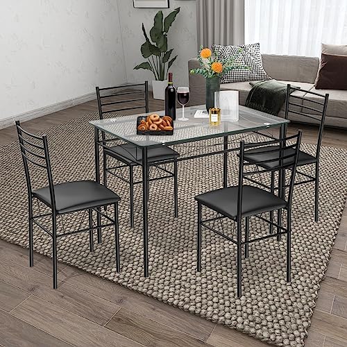 HOMASIS Set di Tavolo da Pranzo con 4 Sedie, Tavolo Vetro, Sedie Sala da Pranzo, Gamba in Metallo, Set 5 Pezzi, Tavolo con Sedie Moderno da Cucina, per Salotto, Cucina, Soggiorno, Nero