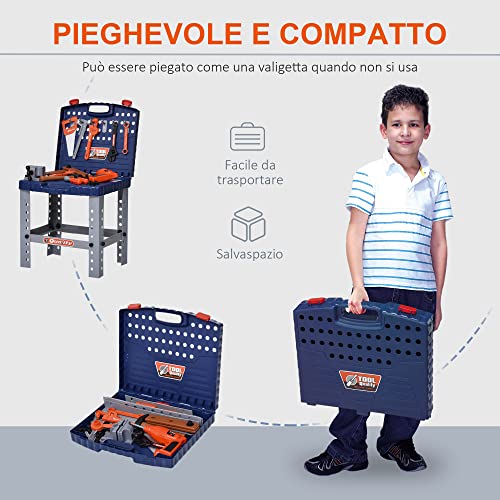 Homcom Banco da Lavoro Giocattolo Pieghevole con 68 Attrezzi Inclusi per Bambini 3-6 Anni, Blu e Grigio, 40x43x72cm