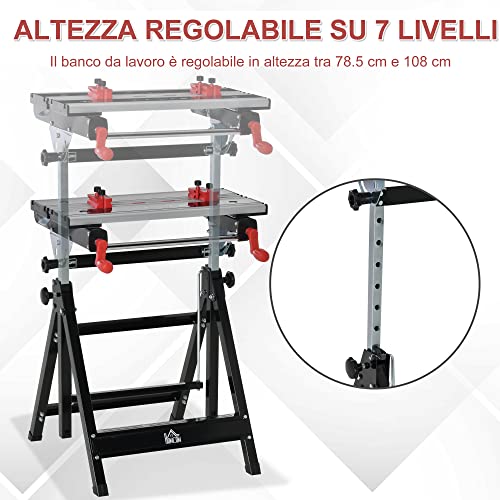 HOMCOM Banco da Lavoro Pieghevole Multiuso, Altezza Regolabile e Morsetti, in Metallo e Alluminio, 60x59x77-107cm, Nero